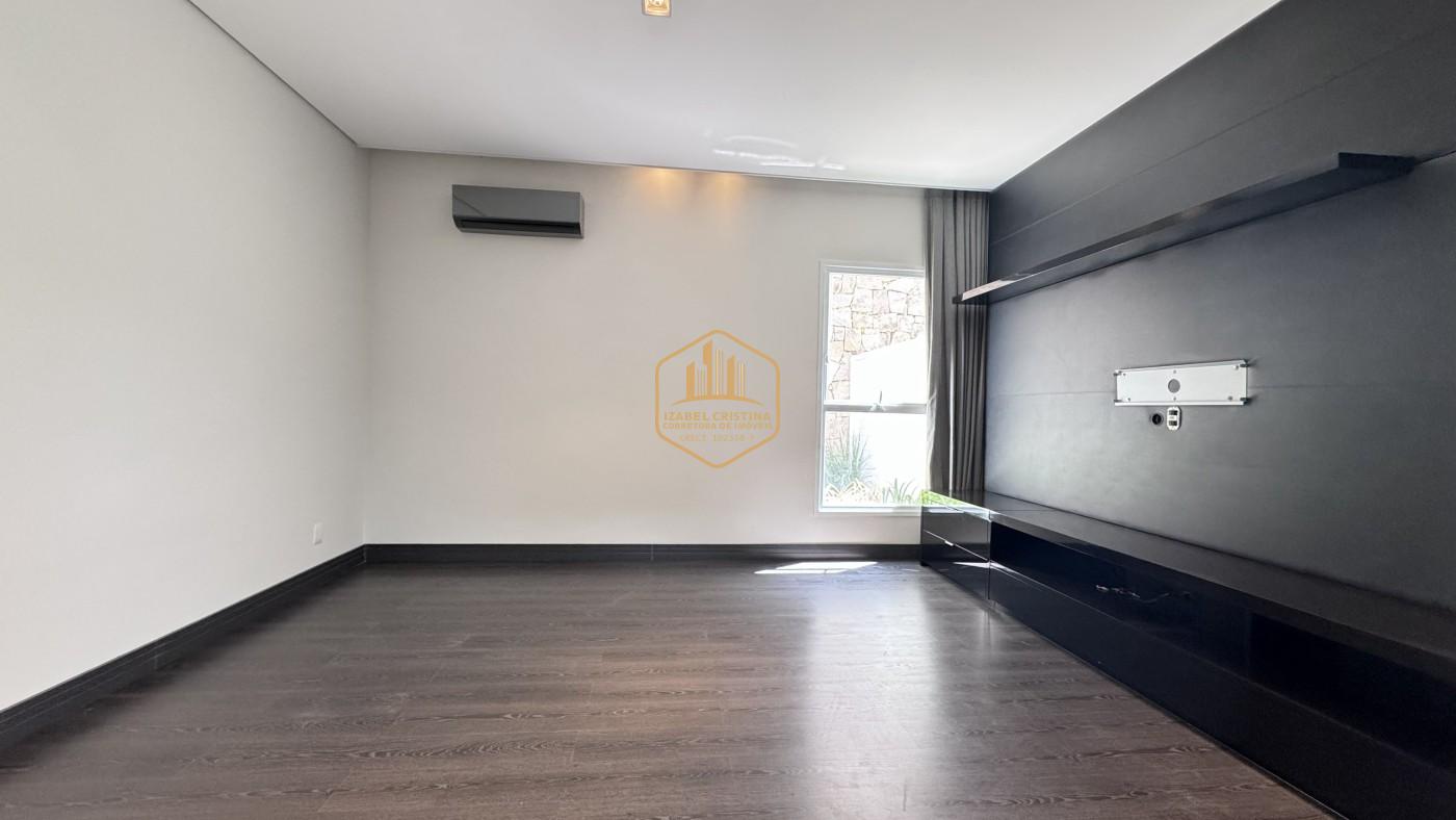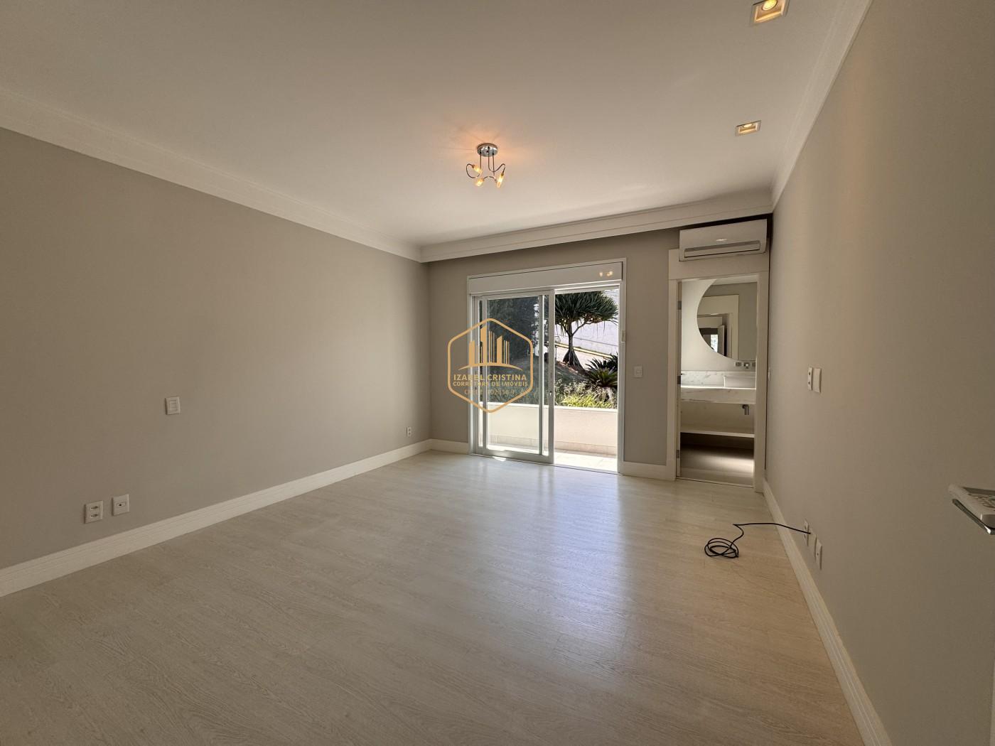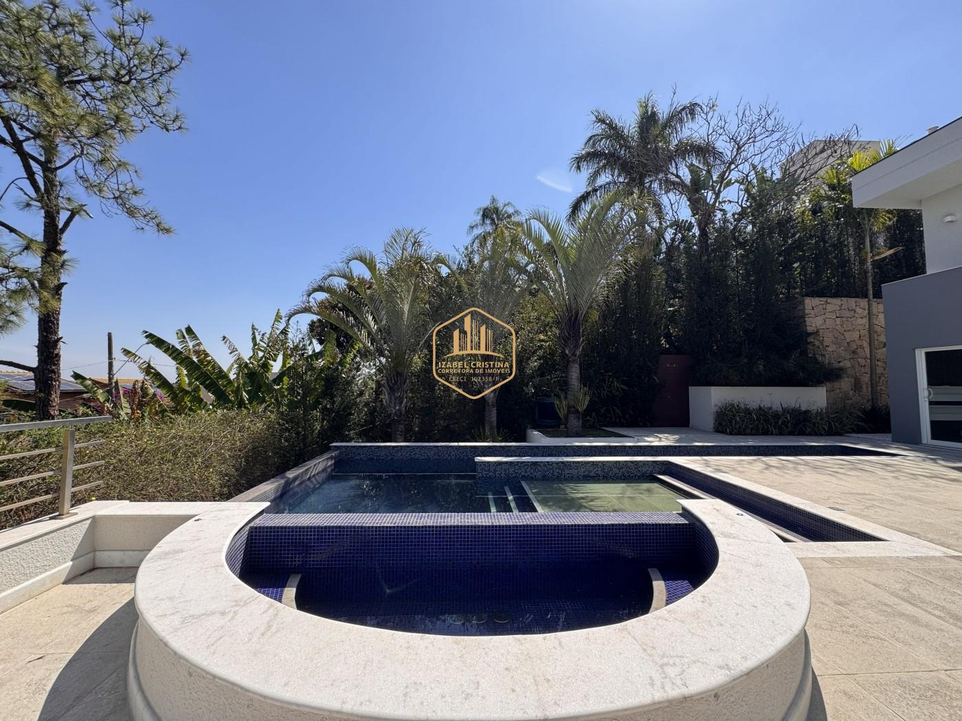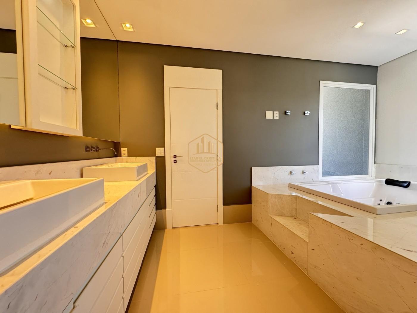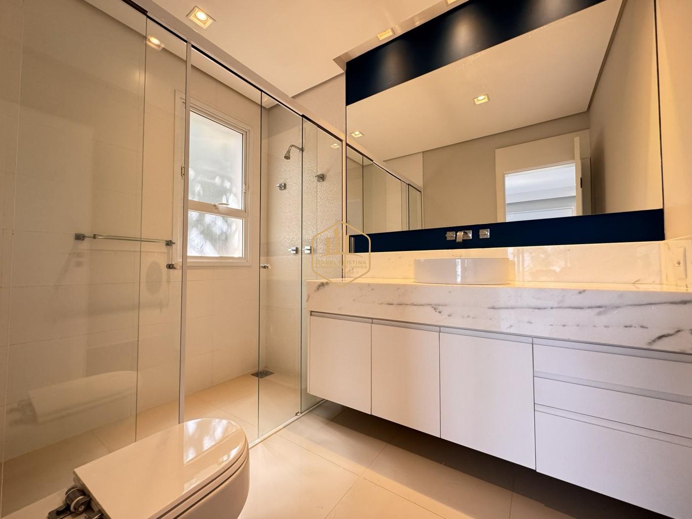 A casa conta com 4 suítes (todas com armários embutidos, ar condicionado e varanda com vista para a piscina), sendo a suíte master com closet, banheira de hidromassagem, lavabo com 2 pias e box com 2 chuveiros.