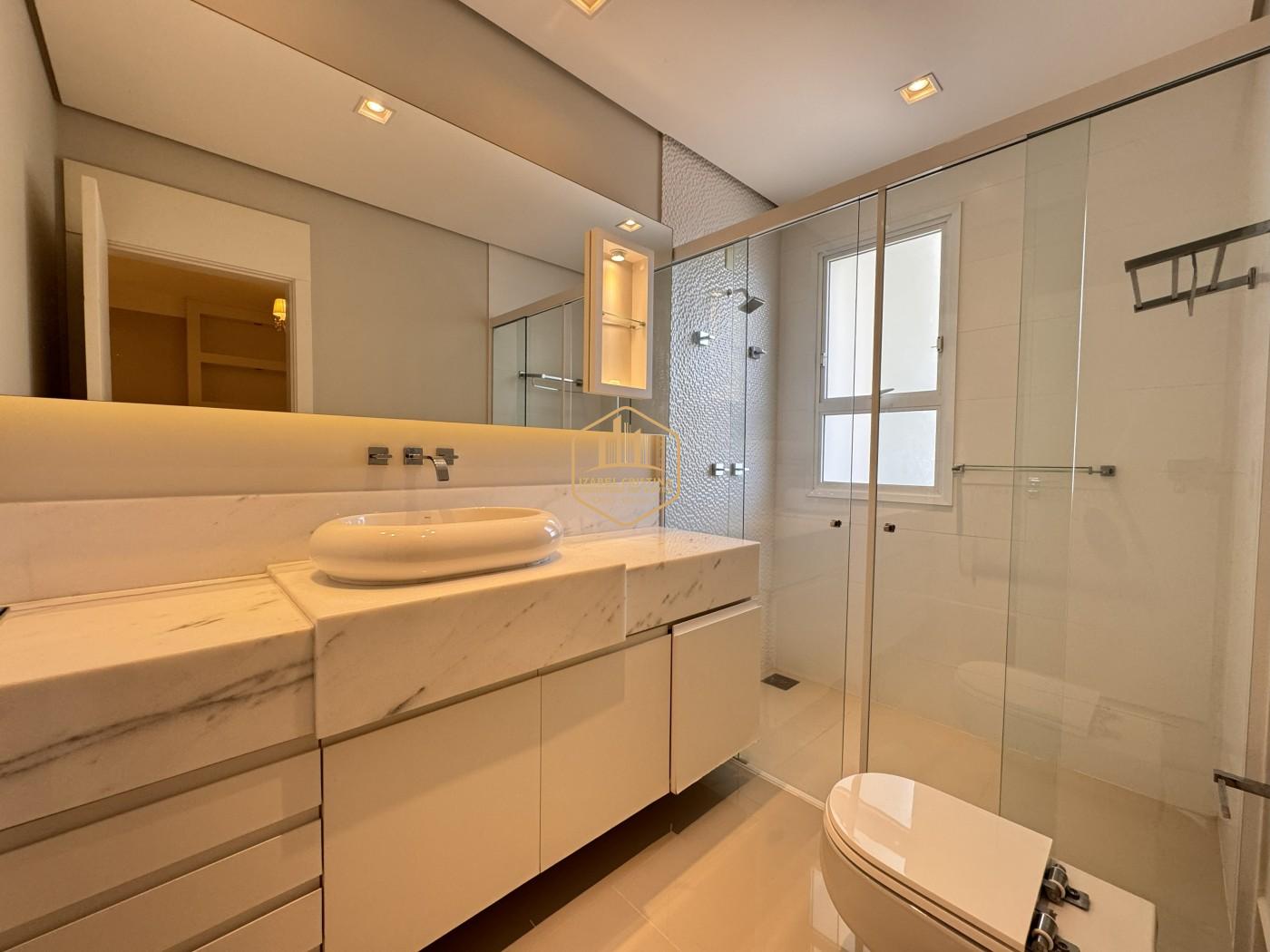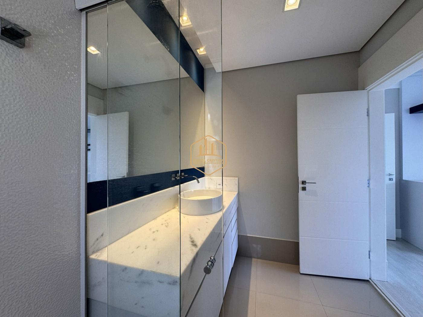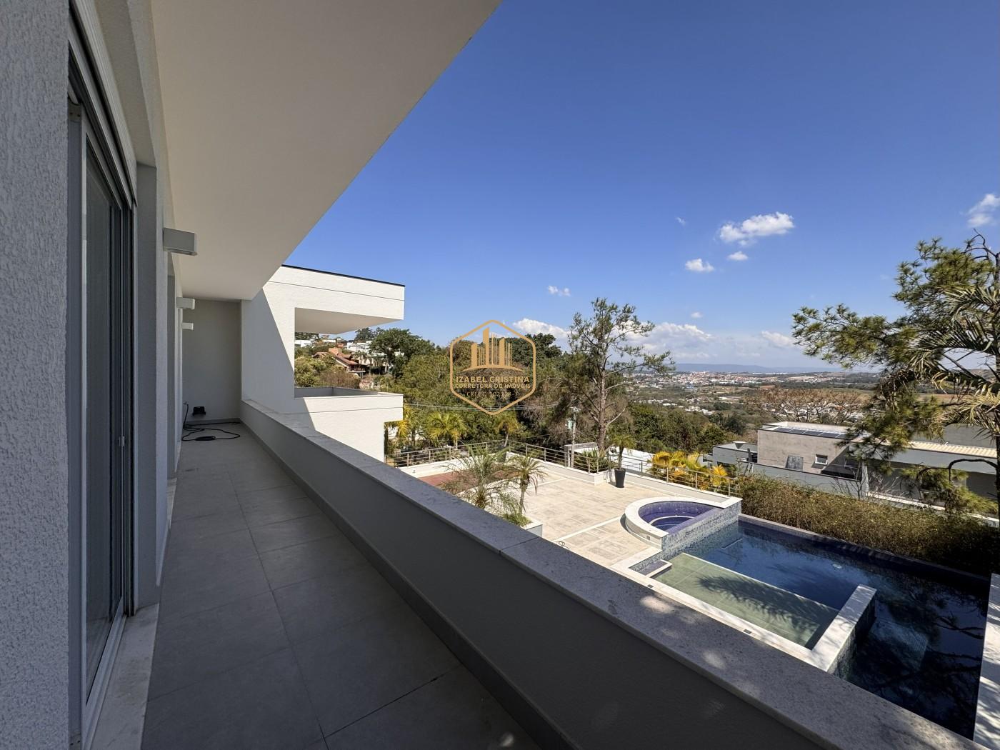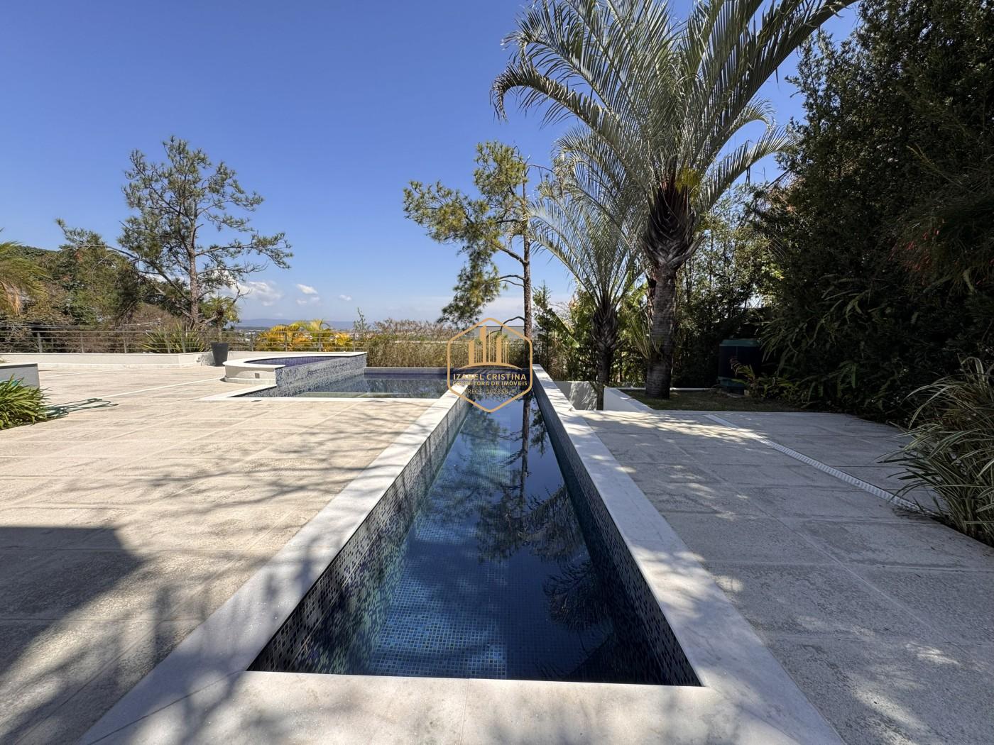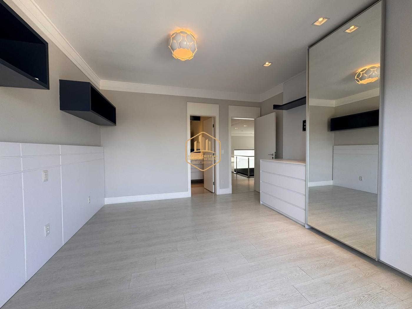 A casa conta com 4 suítes (todas com armários embutidos, ar condicionado e varanda com vista para a piscina), sendo a suíte master com closet, banheira de hidromassagem, lavabo com 2 pias e box com 2 chuveiros.